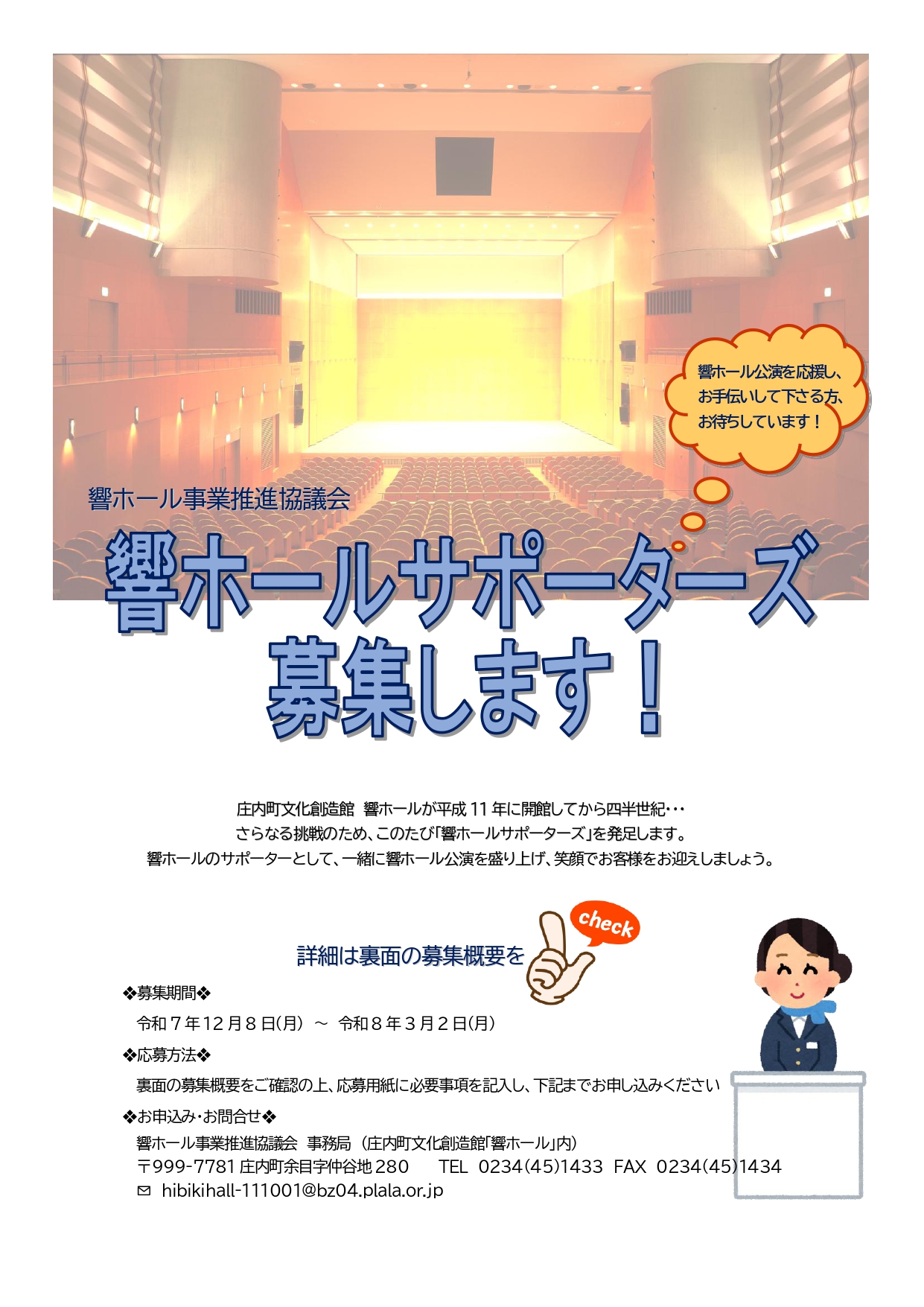 響ホールのサポーターとして、一緒に響ホール公演を盛り上げ、笑顔でお客様をお迎えしましょう。