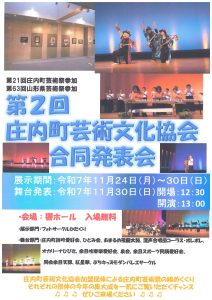 第21回庄内町芸術祭・令和7年度県民芸術祭参加事業 <発表>大ホール 日時:2025年11月30日(日) 開場:12時30分 開演:13時00分 終演:15時30分(予定) <展示>2階町民ギャラリー 11月23日(日)9時00分~11月30日(日)15時30分 ※展示は中止となりました。(11/20更新) ●入場料:無料 ●主催:庄内町芸術文化協会