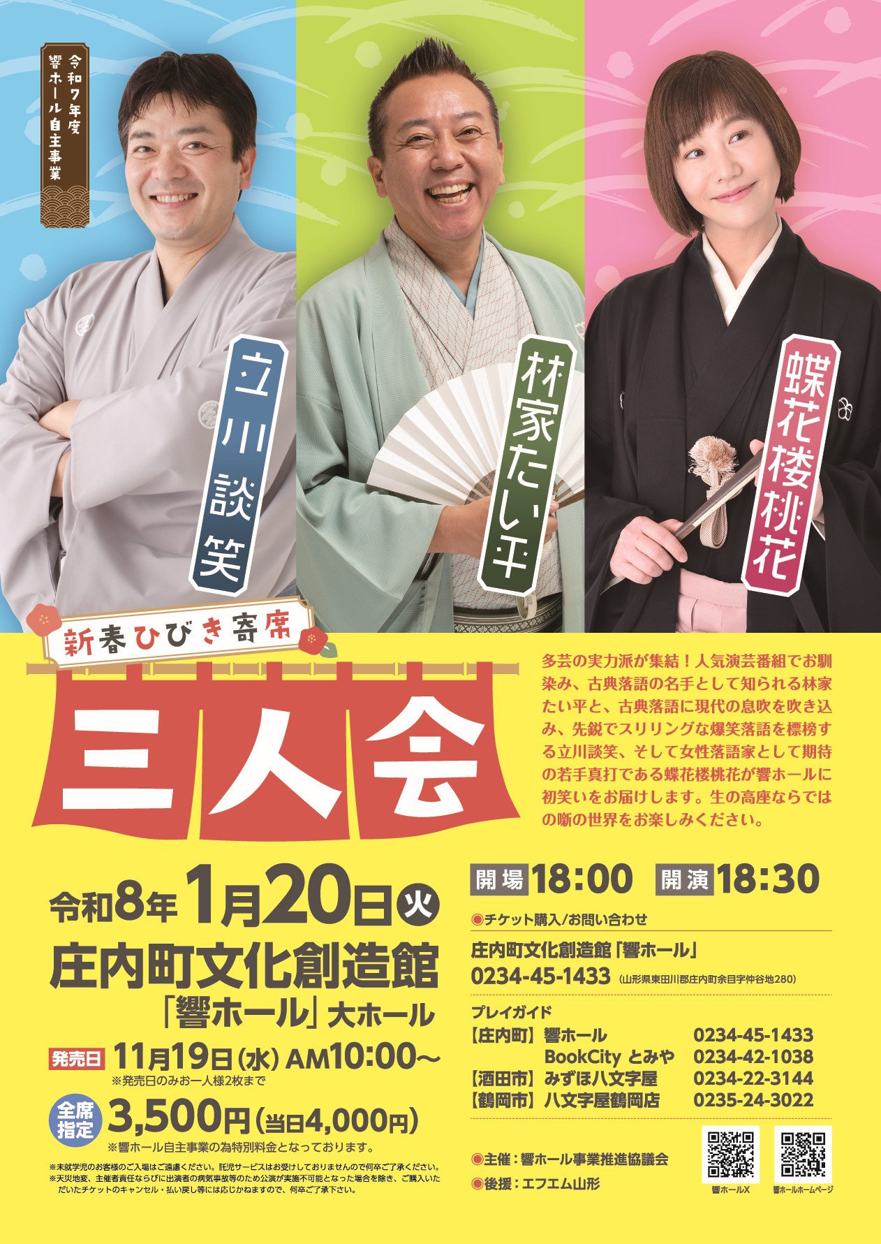 第18回ぷちキッズモダンダンス発表会 [大ホール] 2025年11月9日 余目吹奏愛好会ファミリーコンサート [大ホール] 2025年11月16日 50代から考える資産運用・相続の基礎講座 [研修室2] 2025年11月16日 庄内町企業同友会設立20周年記念講演会 櫻井よしこ氏講演会Sold Out [大ホール] 2025年11月22日 名作こども映画会「がんばれスイミー」 [大ホール] 2025年11月23日 第2回庄内町芸術文化協会合同発表会 [大ホール] 2025年11月30日 福田進一 with 加羽沢美濃&村治奏一 コンサート [大ホール] 2025年12月5日 ~箏・ピアノ・マリンバ~音のirodoriコンサート [小ホール] 2025年12月6日 第59回カワイ音楽コンクール [大ホール] 2025年12月7日 プチ・コンサート ピアノ発表会 [大ホール] 2025年12月13日 林家たい平・立川談笑・蝶花楼桃花 三人会 [大ホール] 2026年1月20日