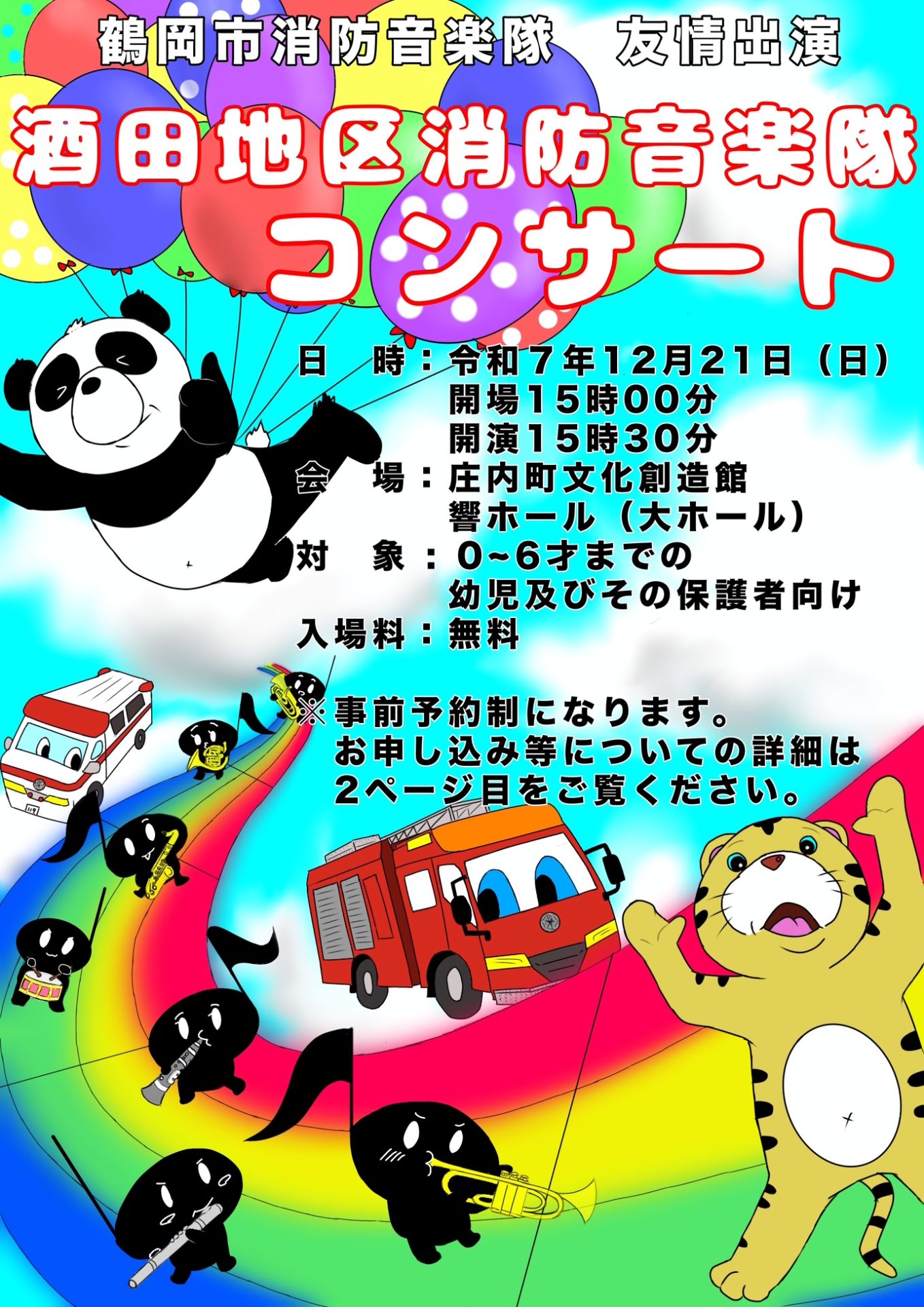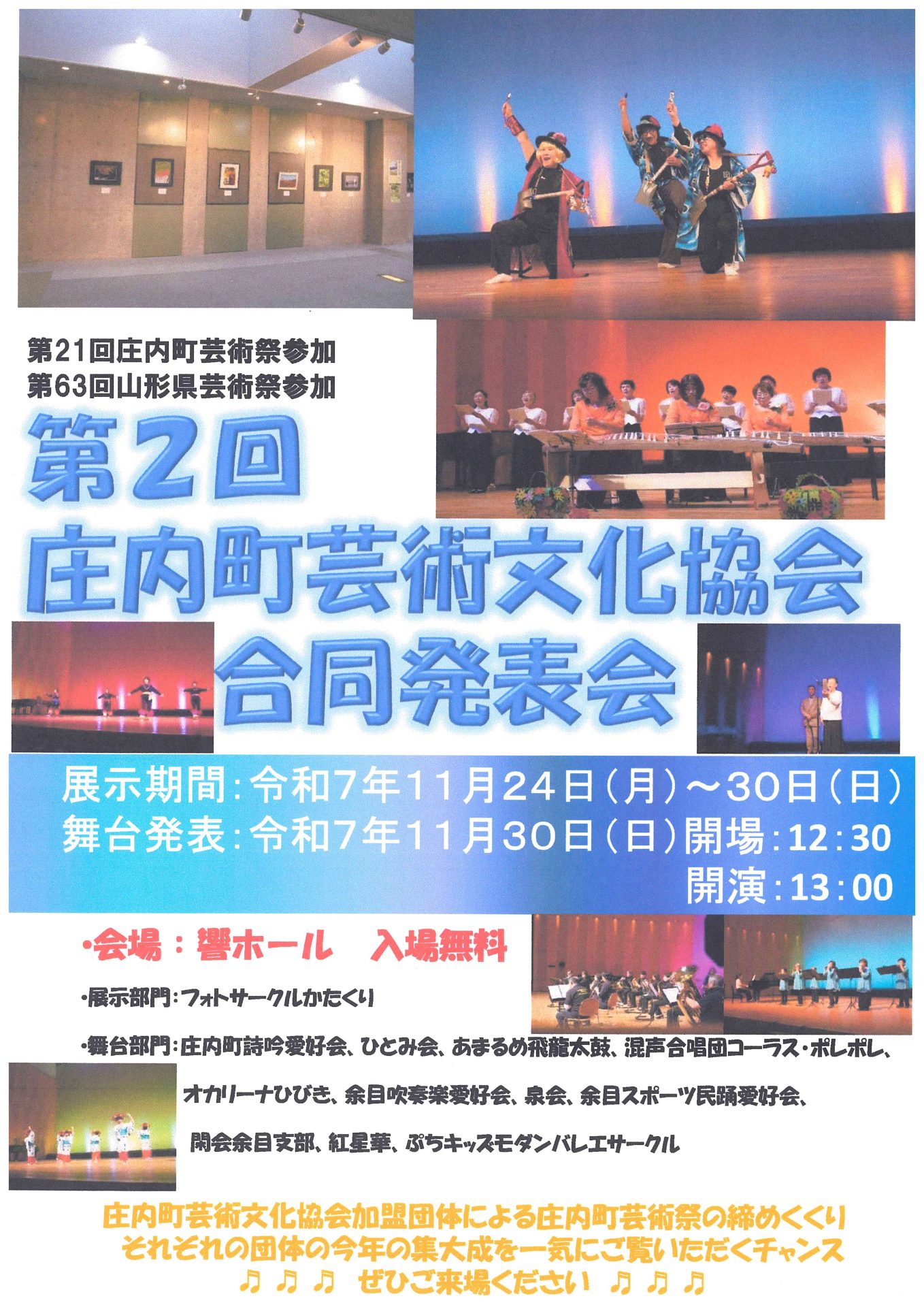 余目吹奏愛好会ファミリーコンサート [大ホール] 2025年11月16日 50代から考える資産運用・相続の基礎講座 [研修室2] 2025年11月16日 庄内町企業同友会設立20周年記念講演会 櫻井よしこ氏講演会Sold Out [大ホール] 2025年11月22日 名作こども映画会「がんばれスイミー」 [大ホール] 2025年11月23日 第2回庄内町芸術文化協会合同発表会 [大ホール] 2025年11月30日 ~箏・ピアノ・マリンバ~音のirodoriコンサート [小ホール] 2025年12月6日 第59回カワイ音楽コンクール [大ホール] 2025年12月7日 プチ・コンサート ピアノ発表会 [大ホール] 2025年12月13日 酒田地区消防音楽隊コンサート [大ホール] 2025年12月21日